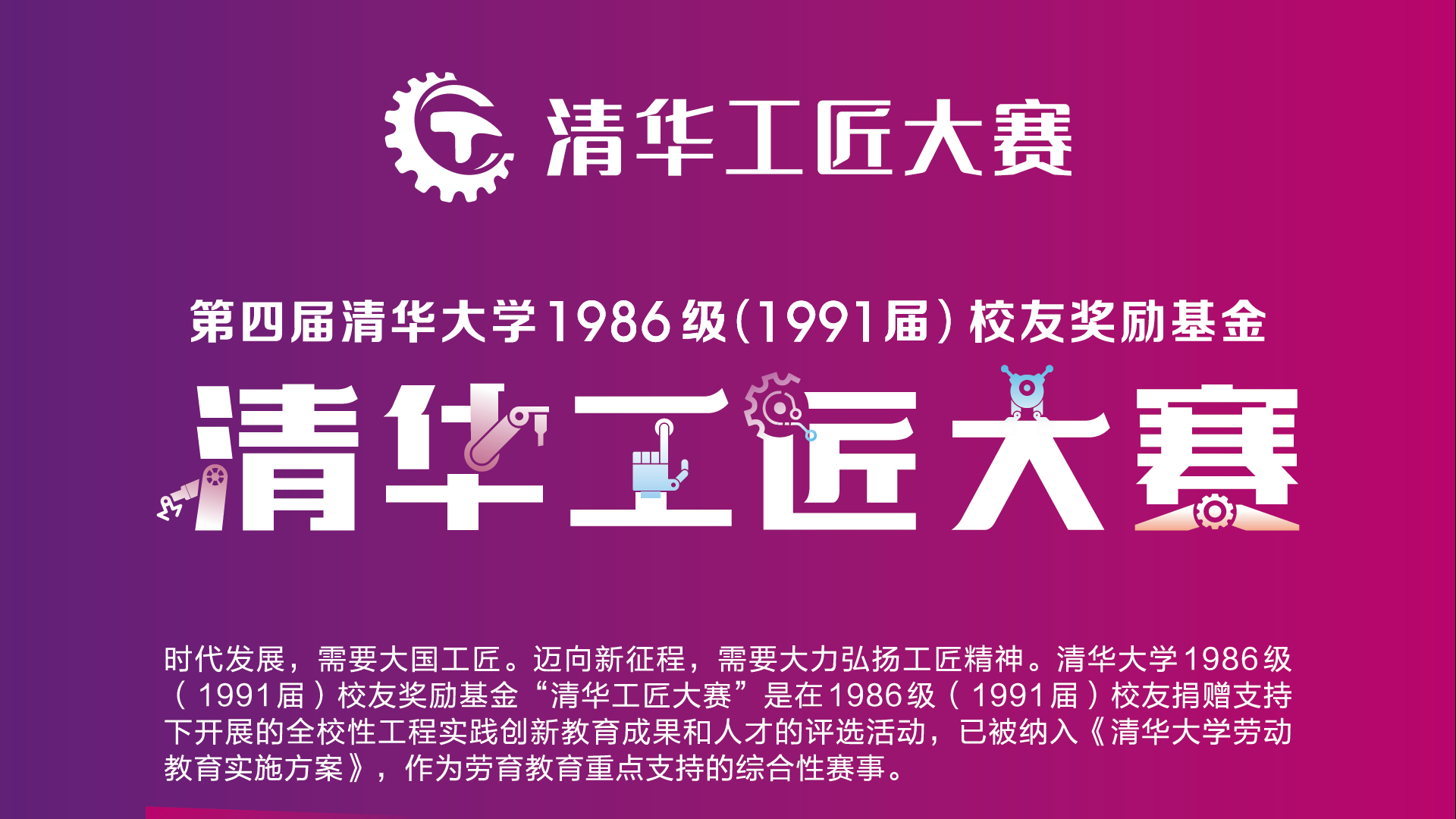 大赛以清华大学的“三位一体”教育理念为核心,“清华工匠精神”的传承为目标,以《清华大学劳动教育实施方案》为指导,面向世界科技前沿、面向经济主战场、面向国家重大需求、面向人民生命健康,围绕国家发展、产业进步、技术创新、社会福祉等主题开展工程实践创新教学、竞赛、人才培养和选拔工作,并组织沙龙、工作坊、训练营等配套品牌活动。