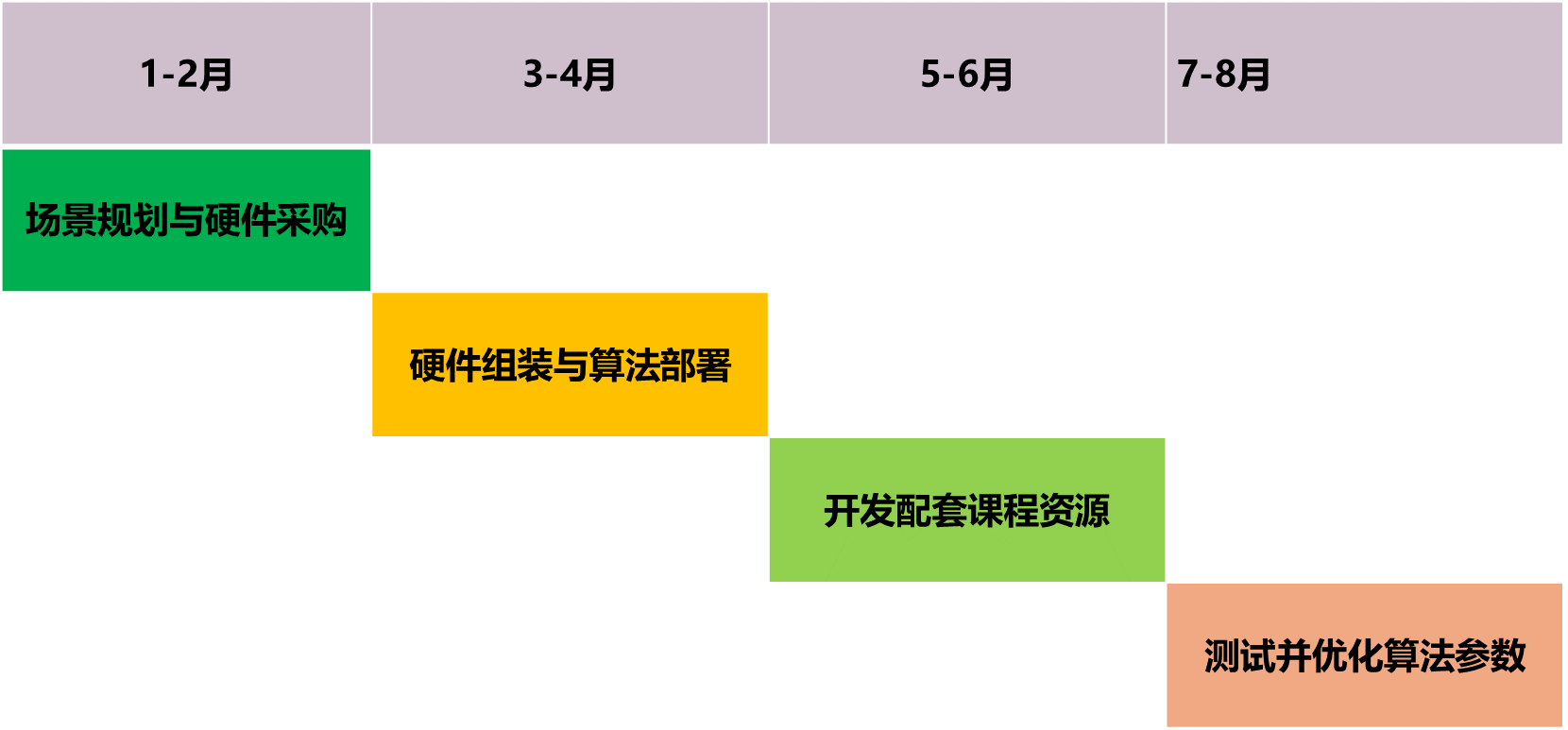 项目计划在8个月内分阶段实施:第1-2月完成场景规划与硬件采购;第3-4月进行硬件组装与ROS算法部署,实现建图、导航与避障功能的联调;第5-6月重点开发配套课程资源,包括实验指导书和系列教学视频;第7-8月开展教学试点,测试平台稳定性并优化算法参数;最后进行功能验收演示,完成教师培训与全部技术文档归档,确保平台交付即可用于实训教学。