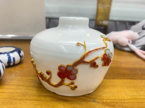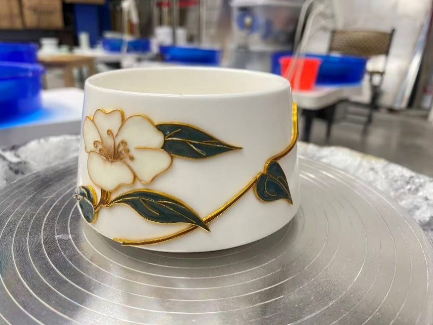 学生利用现有的陶瓷杯在上面直接进行掐丝创作,然后填充珐琅进行烧制。