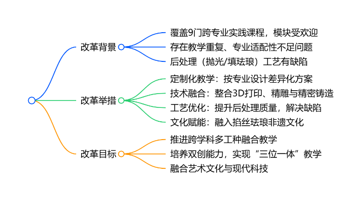 个性化首饰铸造教学模块受到学生好评且覆盖九门不同专业实践课程,因学生能力差异存在重复教学、目标不清晰等问题。本次教学改革将多类先进技术与精密铸造结合,针对不同专业定制教学模式,强化多工种交叉融合。同时优化首饰后处理环节,解决抛光、填珐琅缺陷问题,融入掐丝珐琅等非遗文化,实现艺术文化与现代科技融合,适配双创人才培养需求。