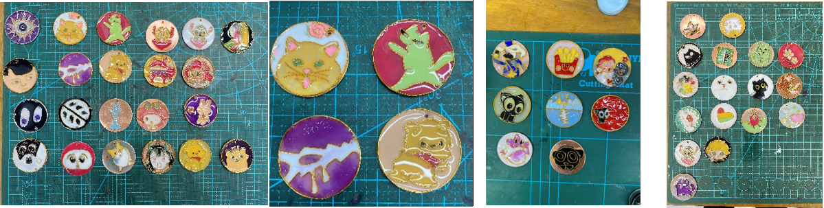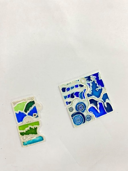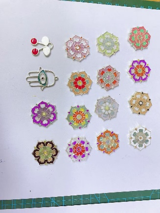 内填低温珐琅:又称低温玻璃珐琅,以低熔点(约 600-800℃)玻璃粉末为原料。填充于金属胎体凹槽或纹样内后,经低温烘烤熔融成型,冷却后与金属牢固结合。具有操作便捷、烘烤温度低、色彩丰富等特点,适配多种金属基底,适合教学实践中的快速创作与个性化设计。内填高温珐琅,也称高温瓷釉珐琅,采用高熔点(约 800-900℃)玻璃质釉料。填充后需经高温焙烧,釉料熔融后紧密附着于金属胎体,冷却后形成质地坚硬、耐磨耐高温、色泽稳定的表层。工艺要求更高,成品质感浑厚、光泽度佳,能与金属精密结合,适合追求高品质与耐久性的首饰制作。