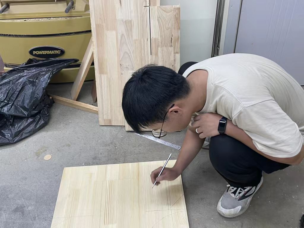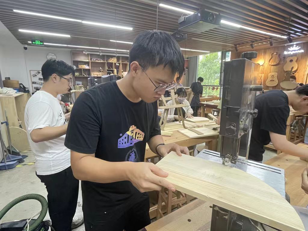 制作一把椅子,需要从实用性、美观性两方面考虑。由于限高,椅子的设计必须力求精巧。通过对“折扇椅”的制作,笔者深刻认识到构思与实际产出之间的差距。例如,在前期筹划中,笔者未思考过上色时可能出现的问题,而在实际操作中,由于操作误差,沿木质纹理溢出的灰色颜料极易侵染白色染料区域,形成不和谐的混合色域。诸如此类“眼高手低”或因经验不足所带来的问题,需要在此后的学习、生产中多加注意。